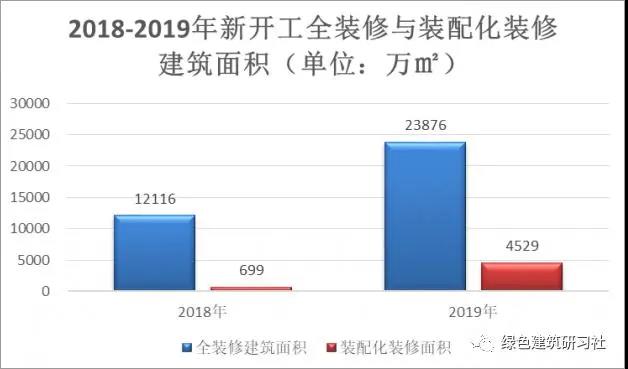 據統計,2019年,全裝修建筑面積為2.4億平方米,2018年為1.2億平方米,增長一倍。其中,2019年裝配化裝修建筑面積為4529萬 m²,2018年這一指標為699萬 m²,增長水平是2018年的5.5倍,發展速度較快,但總量還是偏少。
